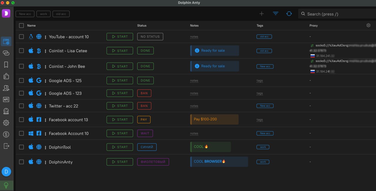 Organization and metadata. For user convenience, Dolphin Anty lets you assign each profile a name, arbitrary tags, a status (e.g., “New,” “Ready,” “Blocked”), and even a color label or icon. Statuses help teams immediately see what’s happening with an account (for example, new, prepared for use, or banned). Text notes can also be attached to profiles to record important information (linked emails, registration dates, budgets, etc.). A flexible filtering and search system (by tags, statuses, proxies, user, primary activity domain, and more) allows quick retrieval of the right account even in large volumes.