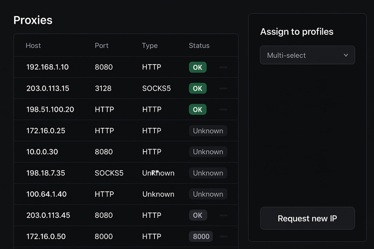 Proxy Manager. Proxies are an essential part of anti-detect browser usage, and Dolphin Anty offers an integrated Proxy Manager for handling them. In a dedicated interface section, you can add proxies of different types (HTTP/SOCKS5), specify authentication details, bulk edit them, or check their availability. Each proxy is then assigned to a specific browser profile (each account has its own exit IP). For mobile proxies, a convenient feature allows IP rotation on demand: a single click in the Dolphin interface refreshes the allocated IP (via the provider’s API URL). This is particularly useful when regularly obtaining a “fresh” mobile IP without changing the proxy itself.